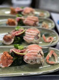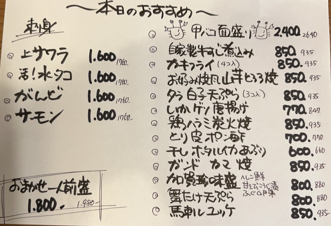 | かじ亭は地元の魚や北陸ならではの珍味 地物の野菜を美味しく 召し上がって頂ける店です。 その日に水揚げされた新鮮な魚とそれに合う 北陸の地酒を準備して、 金沢弁のおねーちゃんORおばちゃんがお出迎え致します。 |