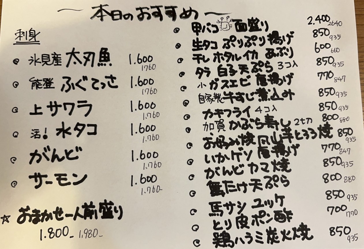 | かじ亭は地元の魚や北陸ならではの珍味 地物の野菜を美味しく 召し上がって頂ける店です。 その日に水揚げされた新鮮な魚とそれに合う 北陸の地酒を準備して、 金沢弁のおねーちゃんORおばちゃんがお出迎え致します。 |